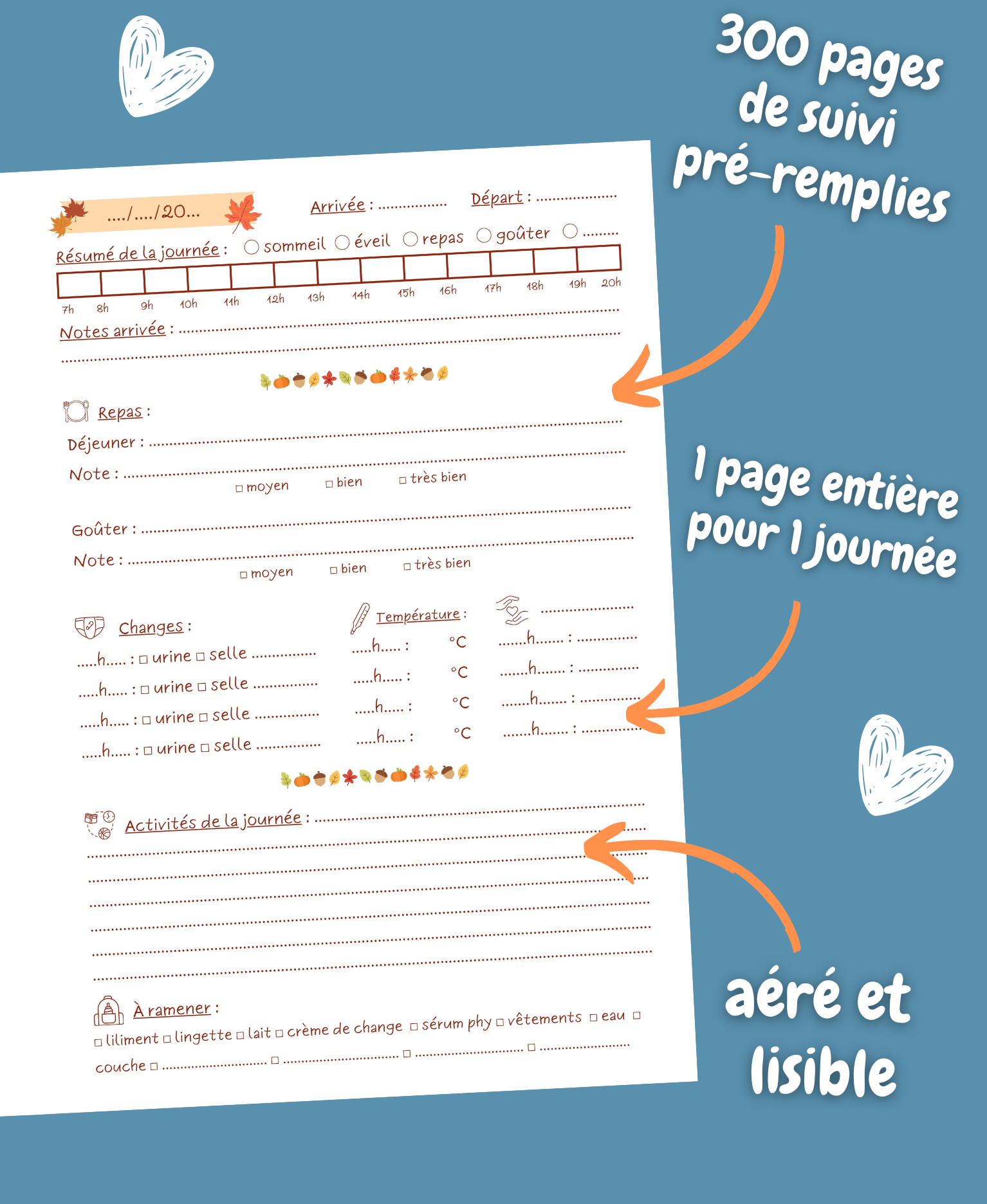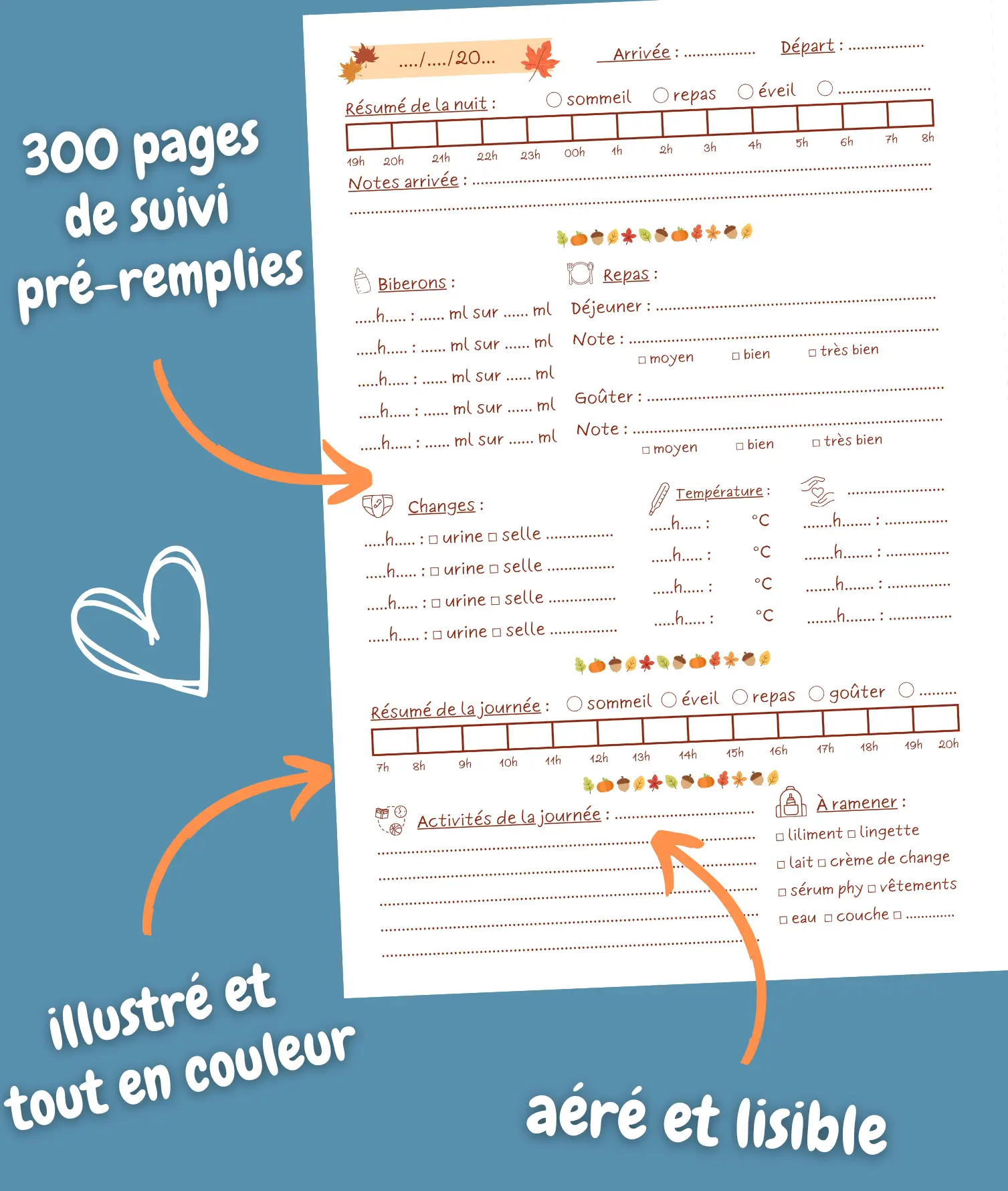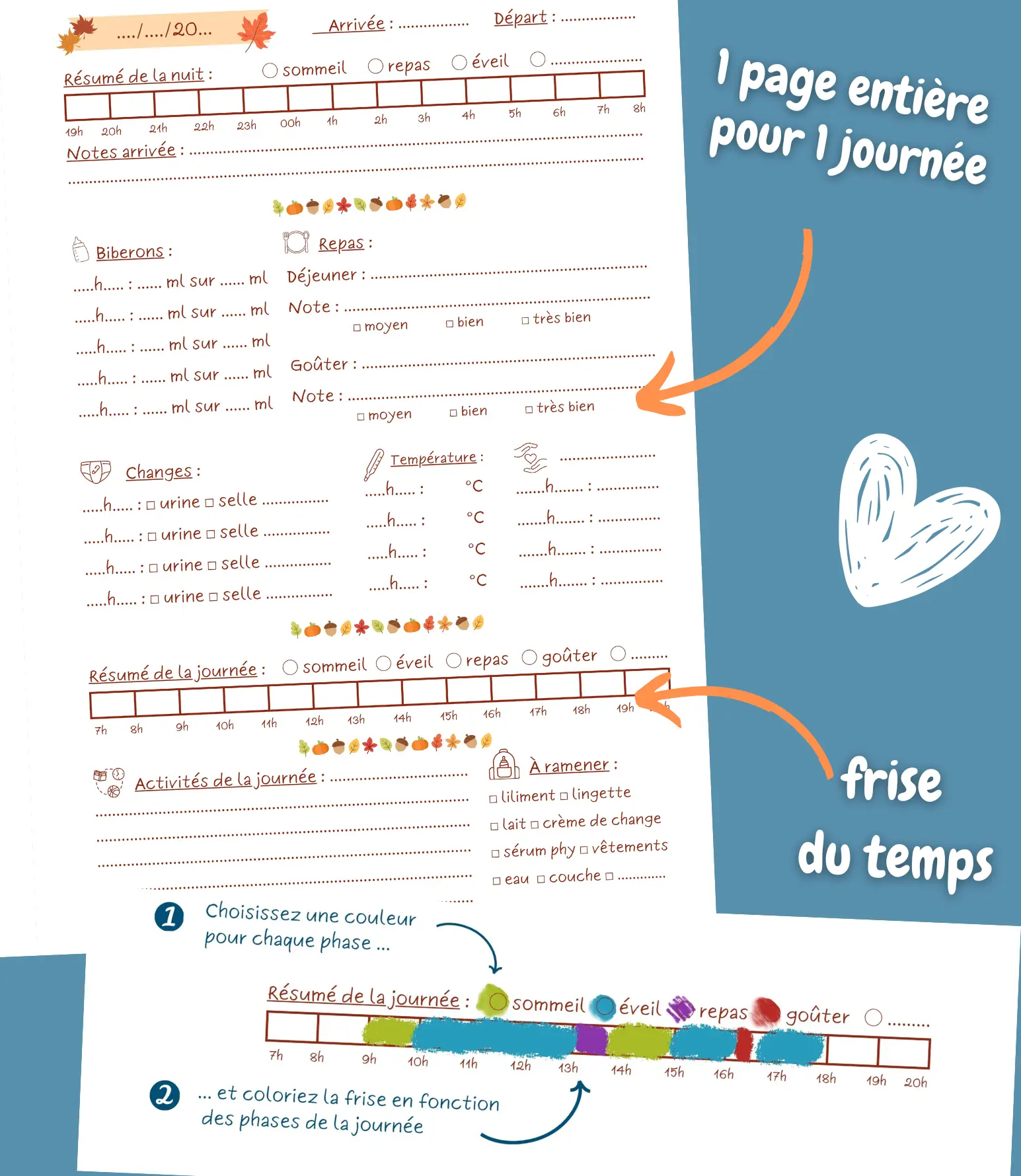 Notez chaque détail important de la journée du bébé ou de l'enfant (selles, urines, biberons, températures, repas, liste des choses à ramener par les parents, activités, notes ... ) sur une page entière.