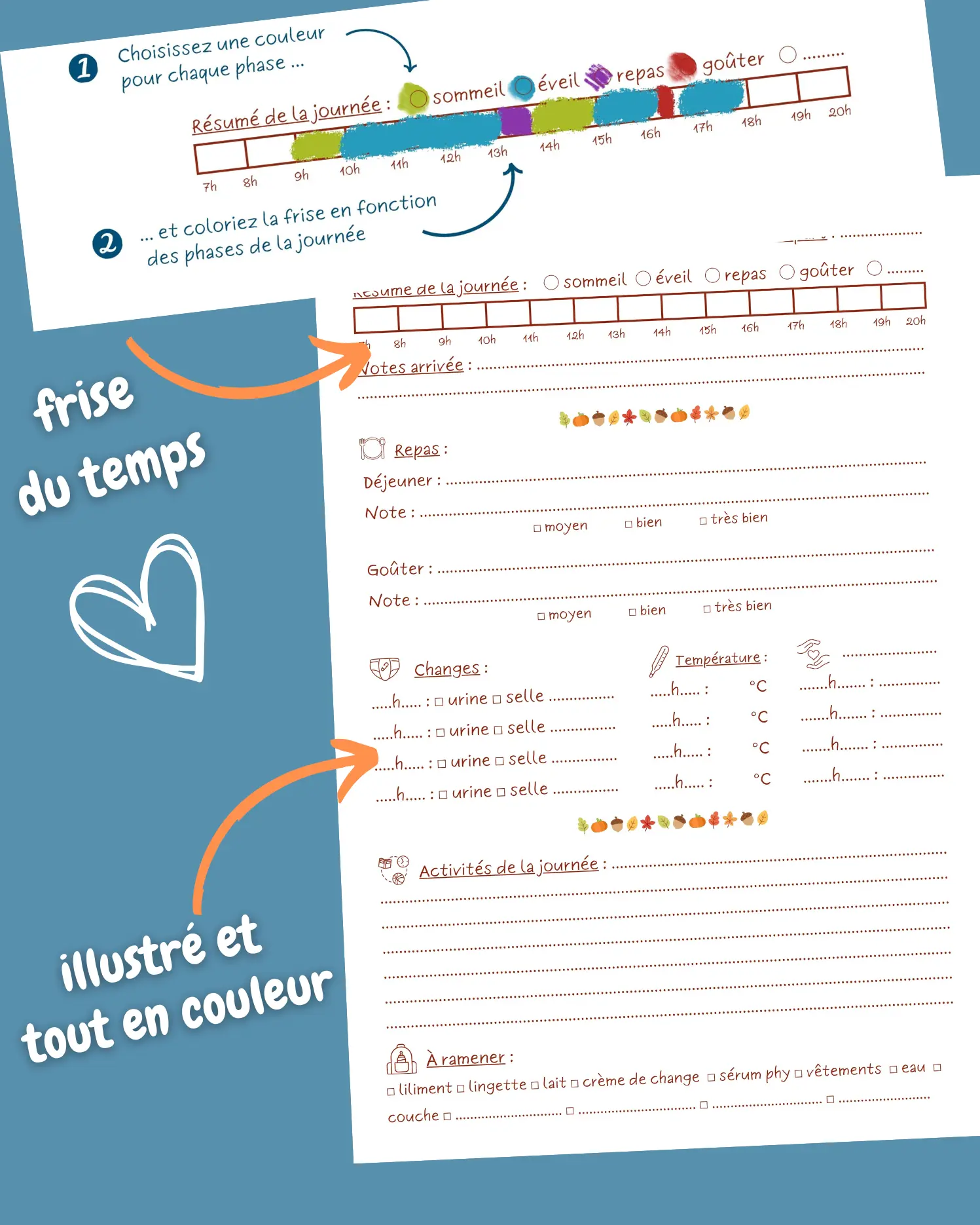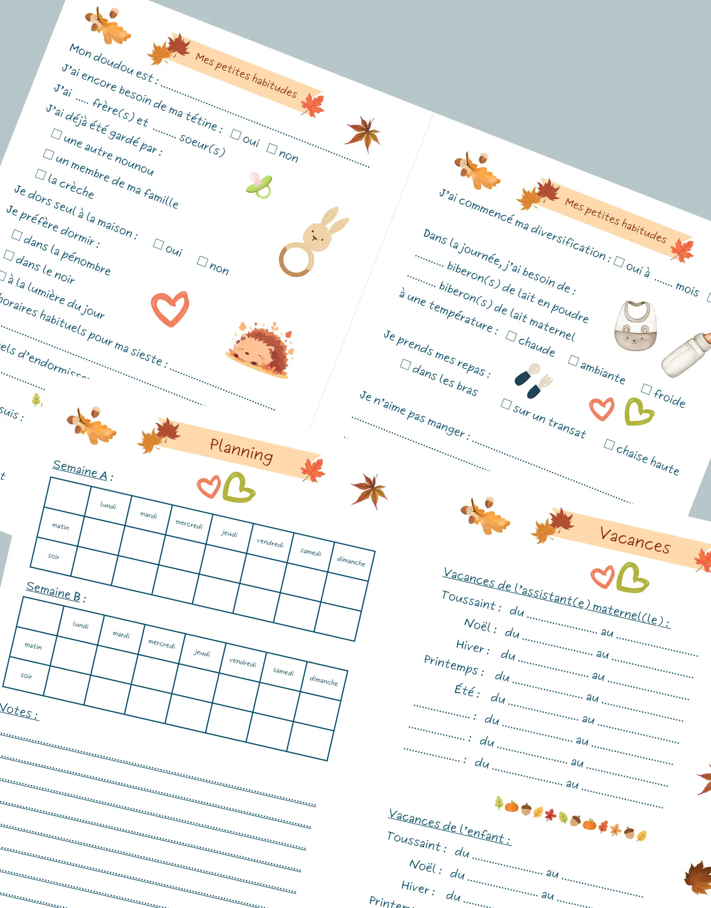 👉 Le carnet centralise tout : repas, sieste, soins, humeur, activités… Rien n’est oublié.